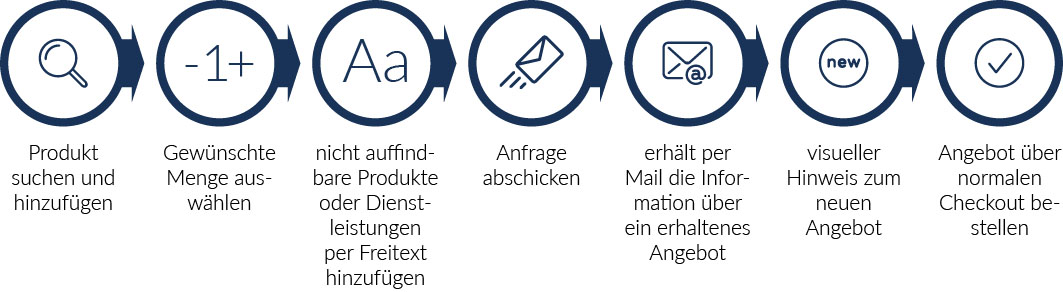 Mit der neuen Anfrage- und Angebotsfunktion verbinden Sie den klassischen Prozess des Einkaufs mit einem Angebotsprozess für Ihre Kunden. Über die zentrale Anlaufstelle können Ihre Kunden direkt im Shop Bestellungen anfragen und von Ihnen ein individuelles Angebot erhalten. Gleichzeitig besteht die Möglichkeit, gezielt individuelle Angebote an Ihre Kunden einzustellen.