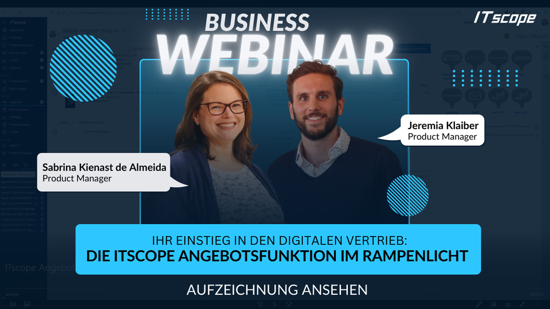 Eine aus­führ­li­che Vorstellung der aktua­li­sier­ten Angebotsfunktion sehen Sie in unse­rer Webinar-Aufzeichnung „Ihr Einstieg in den digi­ta­len Vertrieb: Die ITscope Angebotsfunktion im Rampenlicht“: