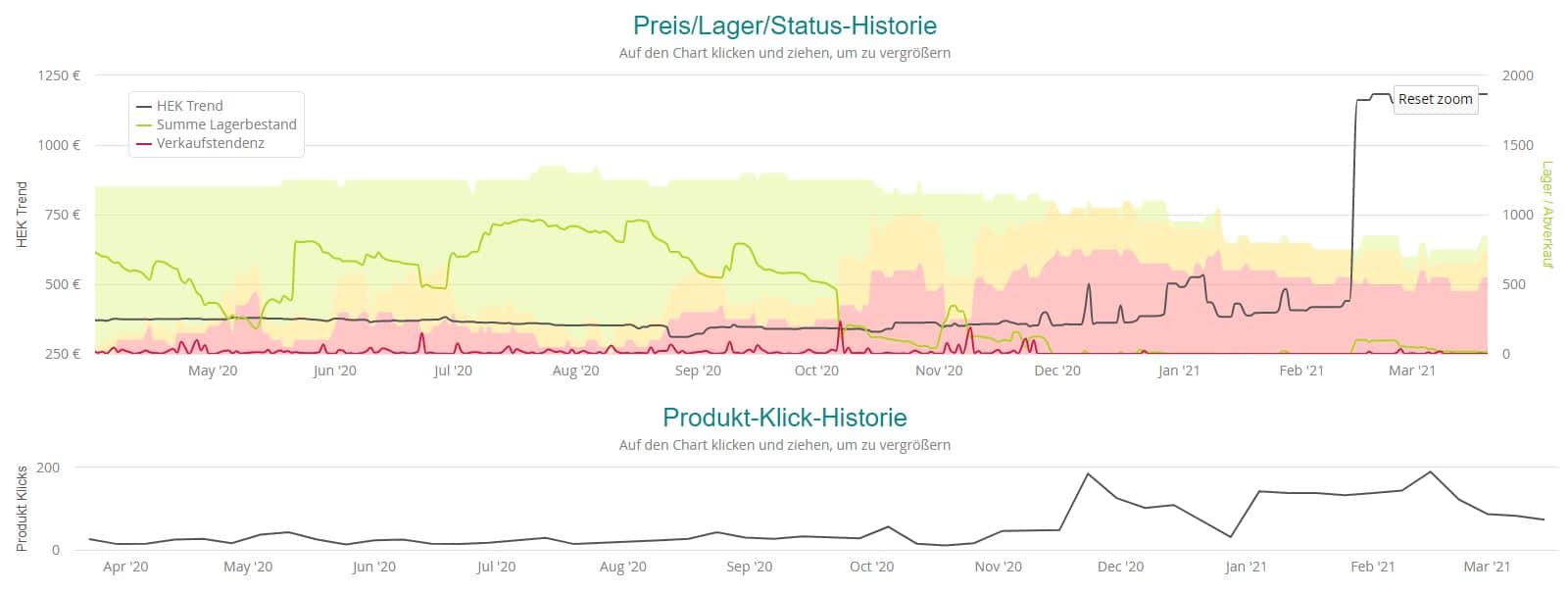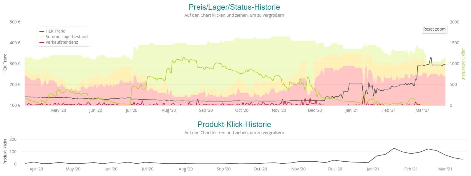 Preis/Lager/Status-Historie und Produkt-Klick-Historie MSI RX 5700 XT GAMING X (Hst.-Nr. V381-032R) April 2020 bis März 2021