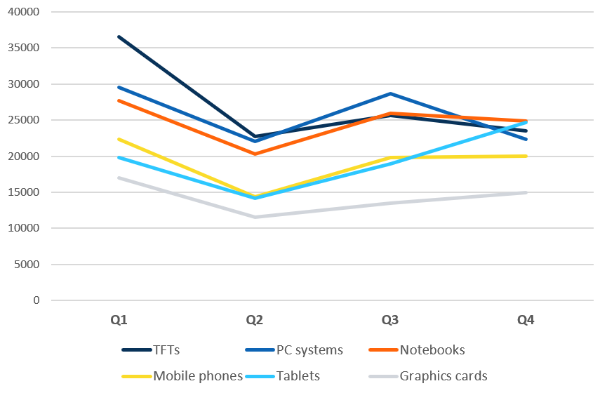Third place in our annual ranking goes to last year’s stars – notebooks. With an average of almost 25,000 clicks per quarter on the respective top 10 products, the notebooks still achieve a very respectable result. Unlike the TFTs and the complete systems, there was a much closer race for the top positions: The ThinkPad E15 Gen 3 20YG with AMD Ryzen 5 5500U processor snatches the first place with 16,248 clicks. It is followed directly by another ThinkPad E15, but the Gen 2 20TD version with Intel Core i5 1135G7 processor. Lenovo’s E‑series stands for business laptops with a clear design, top equipment and a fair price-performance ratio.