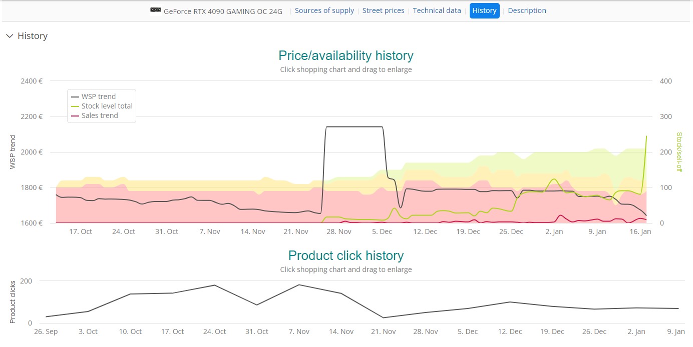 The WSP trend for both the MSI 24GB D6X RTX 4090 Gaming X Trio and the Gigabyte GeForce RTX 4090 Gaming OC is already significantly lower than at the start of sales.