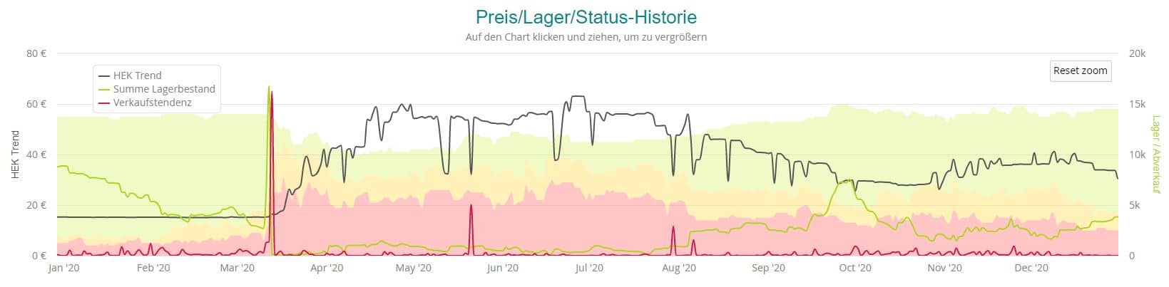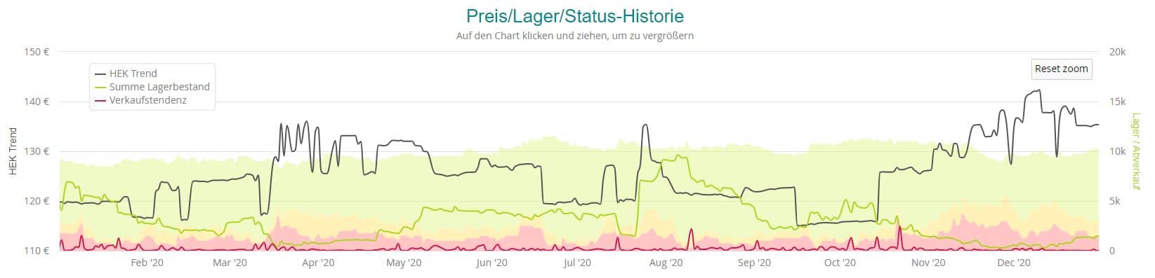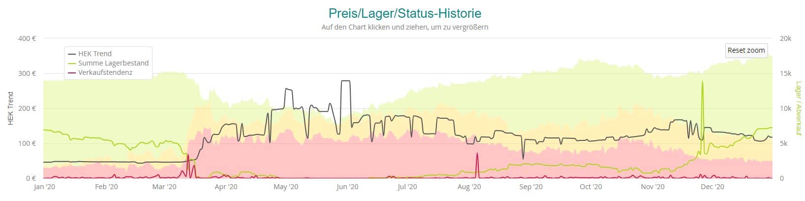 Preis/Lager/Status-Historie und Produkt-Klick-Historie Lenovo ThinkPad E15 (Hst.-Nr. 20RD001FGE) Januar bis Dezember 2020