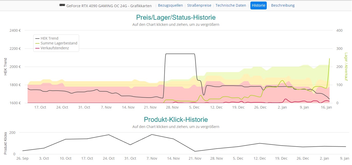 Auch die Gigabyte GeForce RTX 4090 Gaming OC hat den Einstieg auf Platz 4 unserer meistgeklickten Grafikkarten geschafft. 1.313 Klicks verzeichnet die Hochleistungs-Grafikkarte. Benchmarks bestätigen, dass die Grafikkarte besonders bei 4K-Auflösungen durch Schnelligkeit besticht. Mit einem durchschnittlichen Händlereinkaufspreis von 1815,78 € (Stand 03.01.2023) ist die Grafikkarte eines der teuersten Modelle, wobei der Preis bereits zwei Wochen nach dem Verkaufsstart bereits deutlich gefallen ist.ff-Chipsatz GeForce RTX 3090 TI noch häufig geklickt, die ZOTAC GAMING GeForce RTX 3090 TI schafft es sogar auf Platz 6. Der Lagerbestand geht hier aber seit Dezember gen Null, ebenso bei der MSI GeForce RTX 3090 Ti GAMING X TRIO 24G. Wer also gehofft hat, ein Schnäppchen zu machen, wird leider enttäuscht: Trotz der Einführung der neuen Modelle, hielt sich der Preis für die 3090-Modelle bis zuletzt relativ konstant.