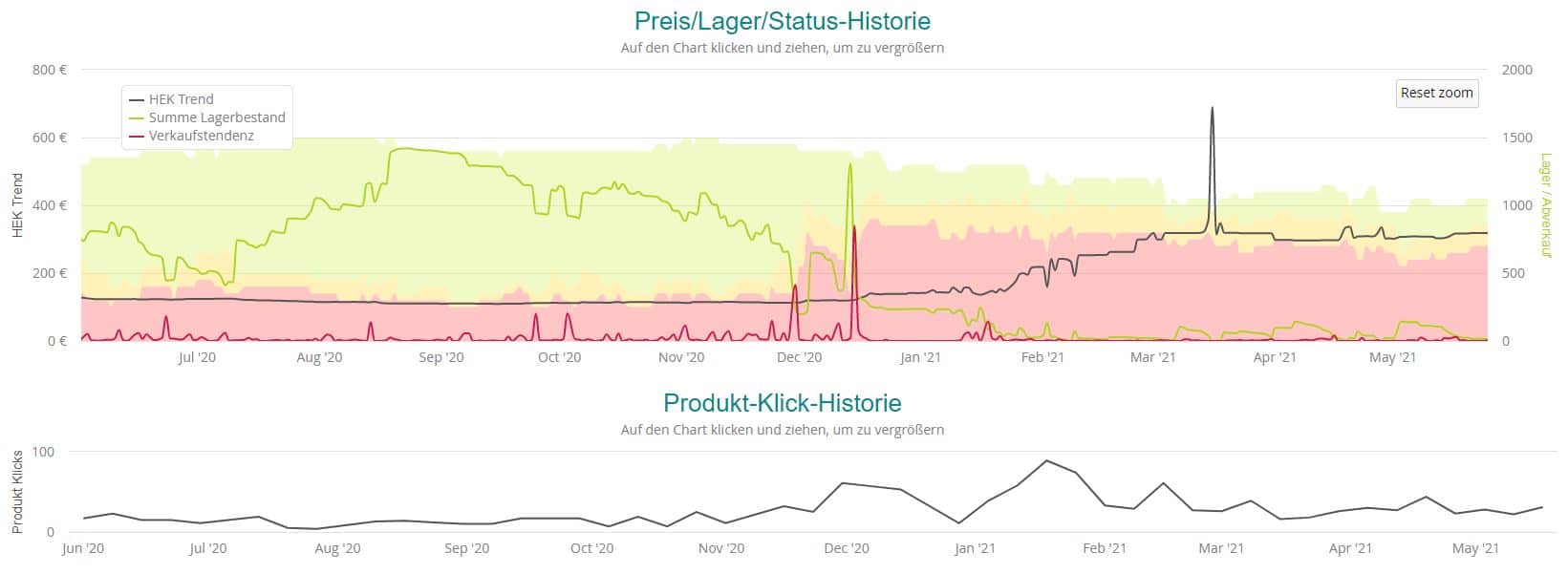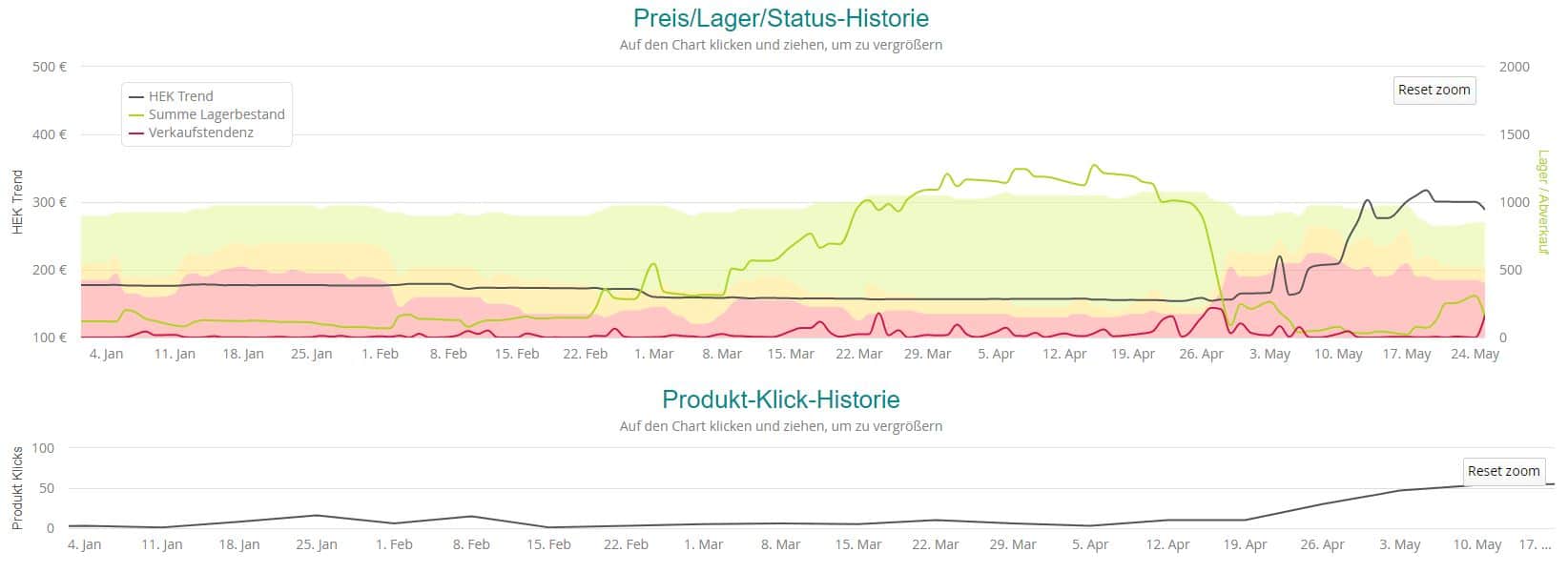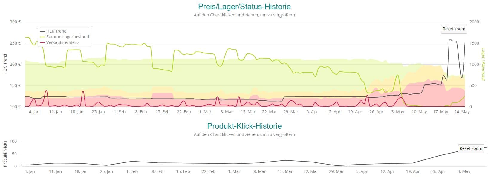 Noch kritischer sieht es bei der Backup Plus Hub STEL8000200 von Seagate aus. Fast zeitgleich mit der Elements Desktop fällt auch bei dieser Festplatte der Lagerbestand Anfang Mai extrem. Dementsprechend sind auch die Auswirkungen auf den HEK, der sich auch in diesem Fall in nur wenigen Wochen von 120 auf über 250 Euro verdoppelt hat.