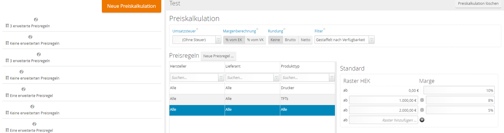 - In der Preiskalkulation können nun die Variablen (sprich die Hersteller, Lieferanten und Produkttypen) bereits erstellter Preisregeln verändert werden.