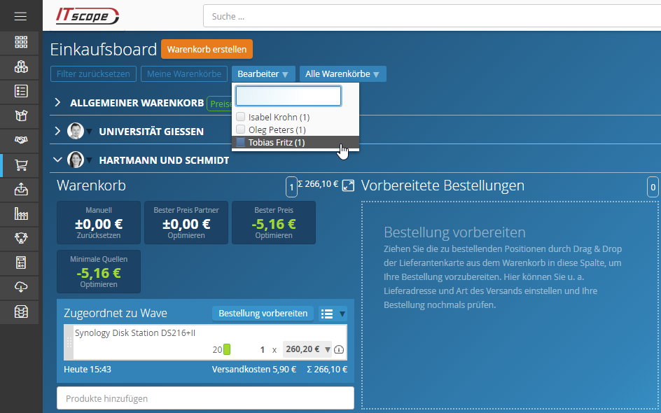 Jeder Warenkorb ist zunächst jenem Mitarbeiter zugewiesen, der ihn erstellt hat, kann aber jederzeit einem anderen Kollegen zugeteilt werden. Durch Klick auf den Avatar neben dem Namen des Warenkorbs können Sie ganz einfach einen Kollegen auswählen. Das ist insb. dann hilfreich, wenn ein bestimmter Kollege eine bestimmte Kundengruppe betreut. Auch im Vertretungsfall bei Urlaub oder Krankmeldung können so schnell und flexibel die Zuständigkeiten geklärt werden. Jeder Mitarbeiter in ITscope sieht dann auf einen Blick, wer den betreffenden Warenkorb übernimmt.