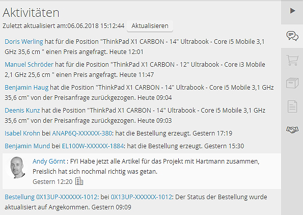 - Der Aktivitäten-Stream dokumentiert übersichtlich alle Ereignisse in Zusammenhang mit Ihren Warenkörben, Preisanfragen und Bestellungen.