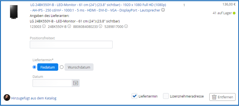 Nachdem Sie die Checkbox „Liefertermin“ aktiviert haben, können Sie das gewünschte Fix- oder Wunschdatum eintragen.
