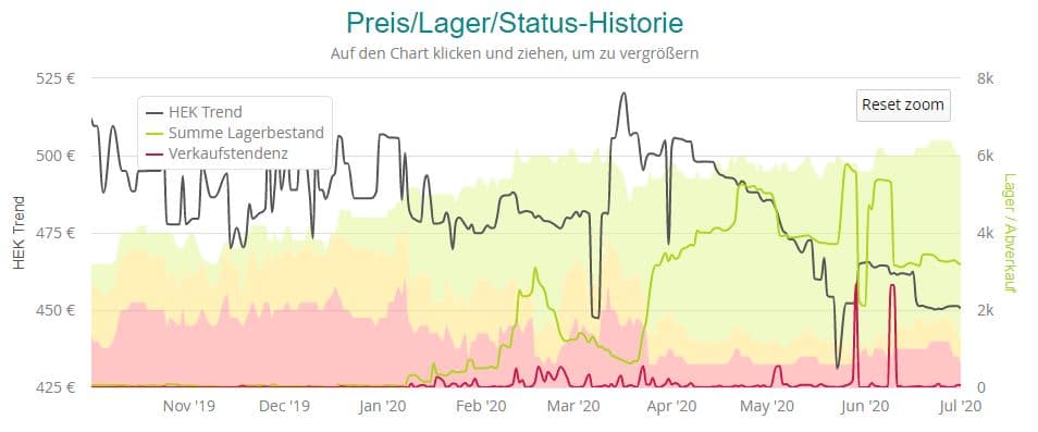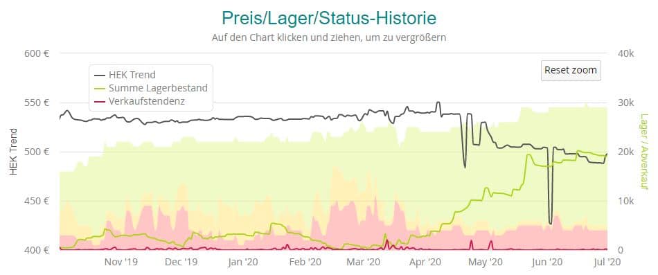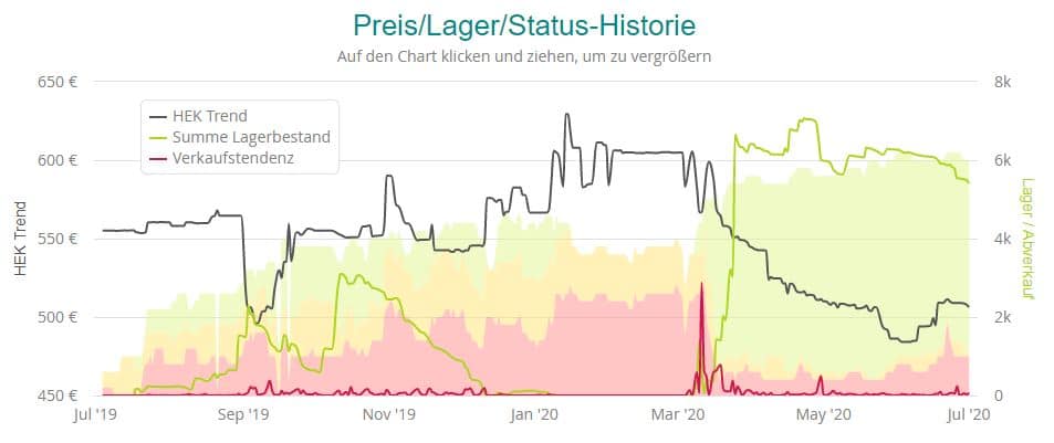 Außerdem liegt beim HP ProDesk 400 G6 die Verkaufstendenz zwi­schen Januar und März bei null – denn die Lager sind leer. Eine mög­li­che Erklärung dafür könn­ten Lieferengpässe auf­grund des Lockdowns in China sein. Im März folgt dann ein kur­zer Ausschlag der Verkaufstendenz und der Bedarf wird nach­ge­holt. Danach sin­ken die Verkaufszahlen jedoch rasch wie­der und die Lager blei­ben gefüllt. Wie es scheint, sol­len nied­ri­ge­re Preise dem sin­ken­den Absatz nun entgegenwirken.